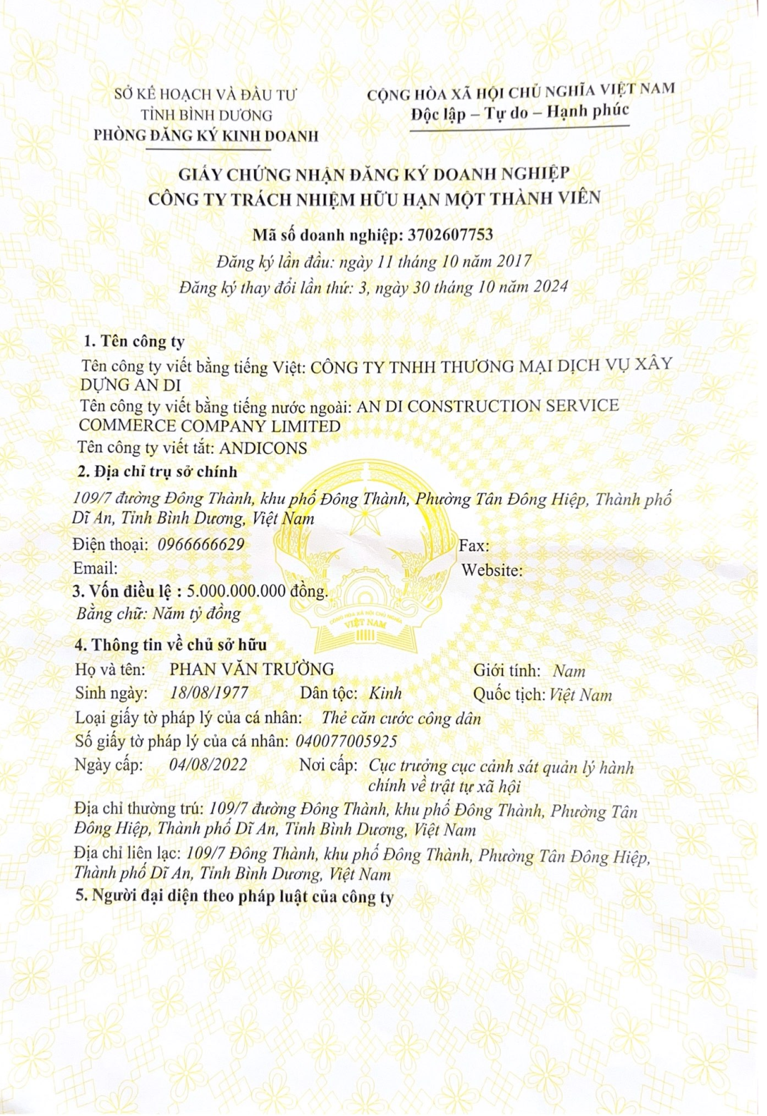 Công ty TNHH TM DV XD An Di được thành lập 2017 với các lĩnh vực ngành nghề hoạt động chủ yếu: